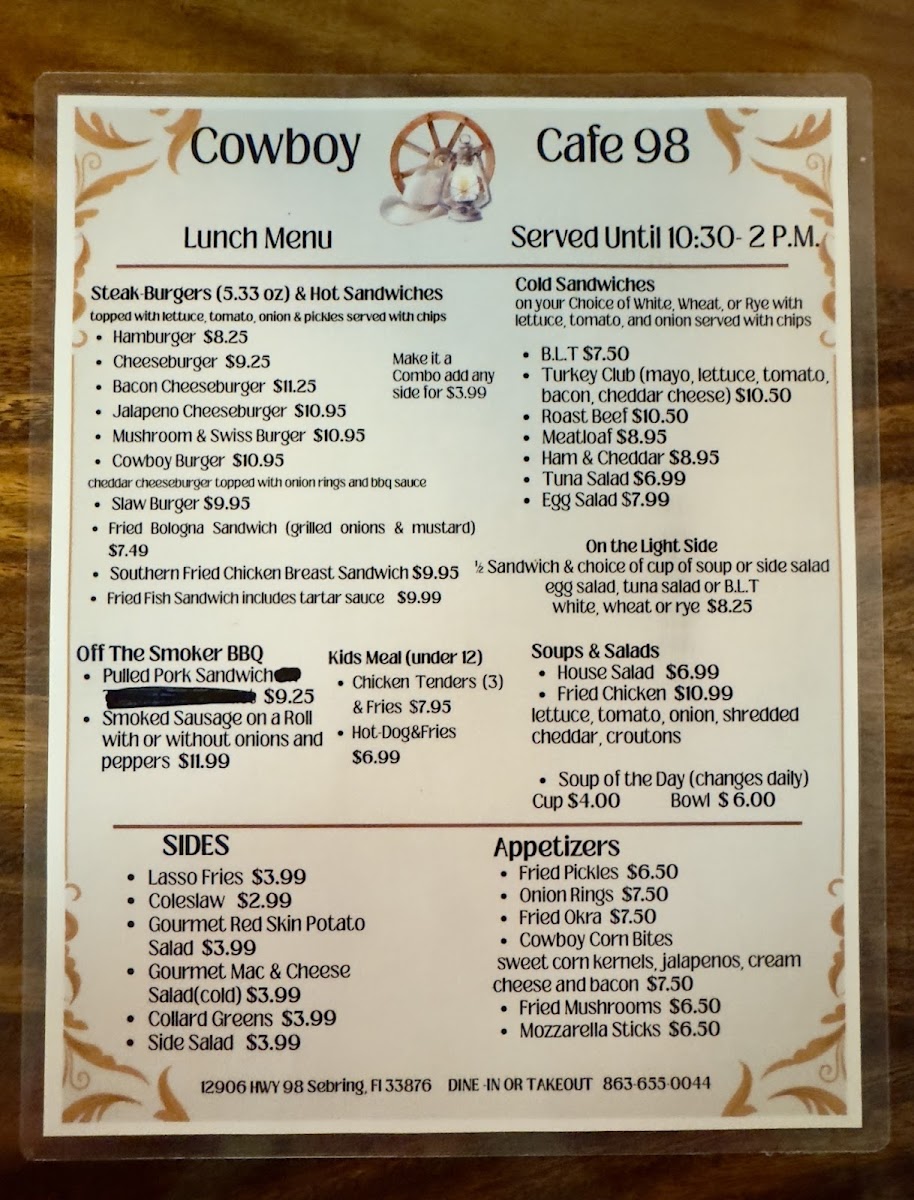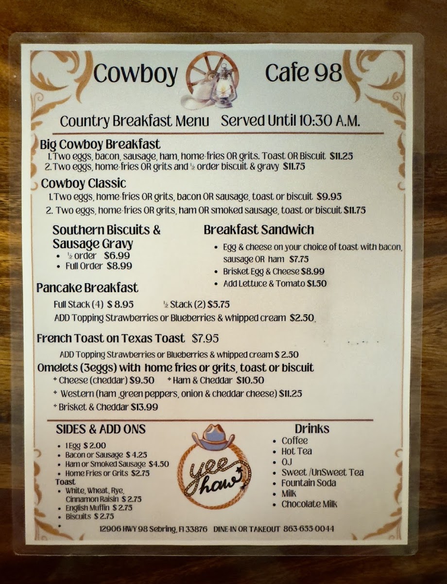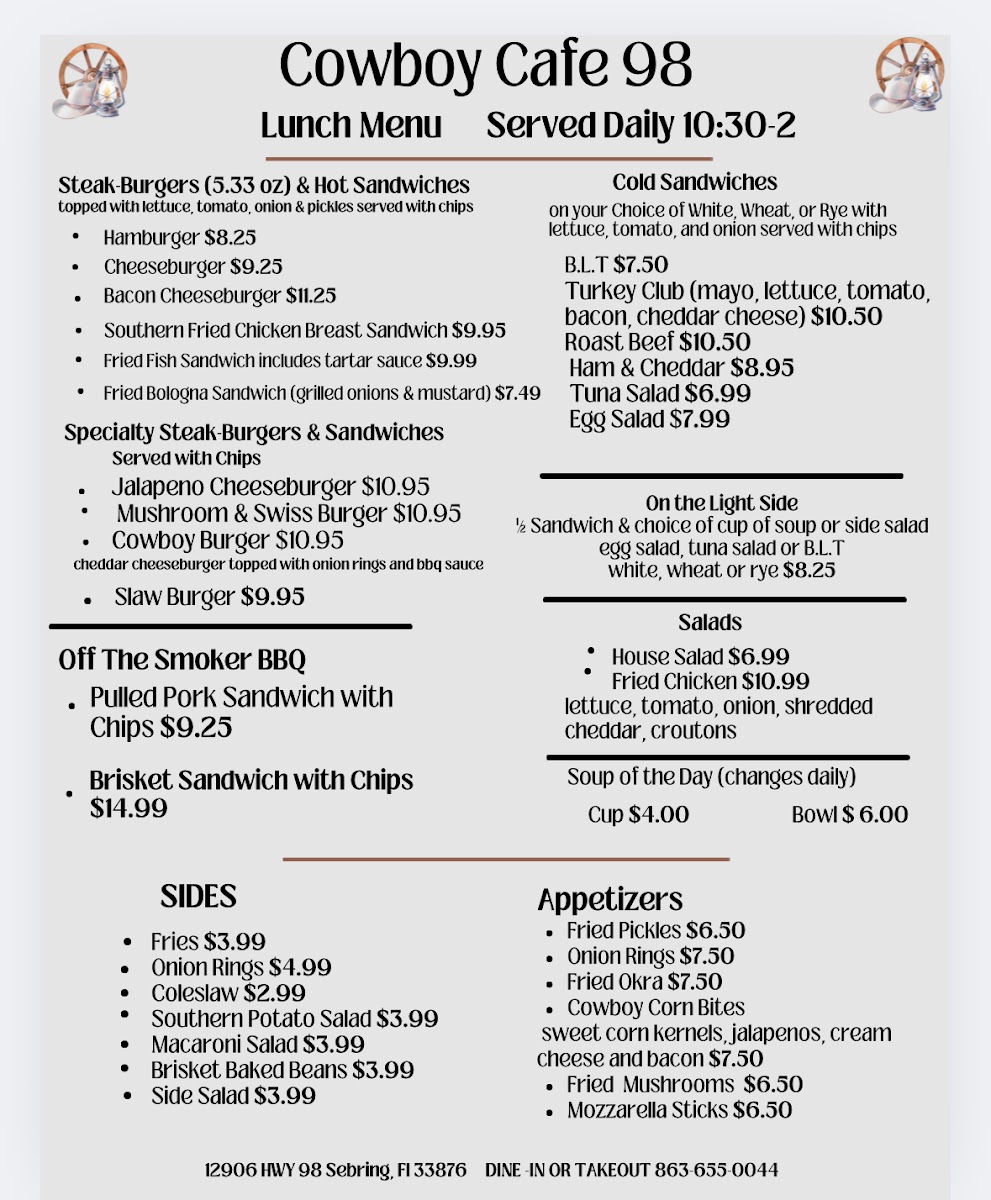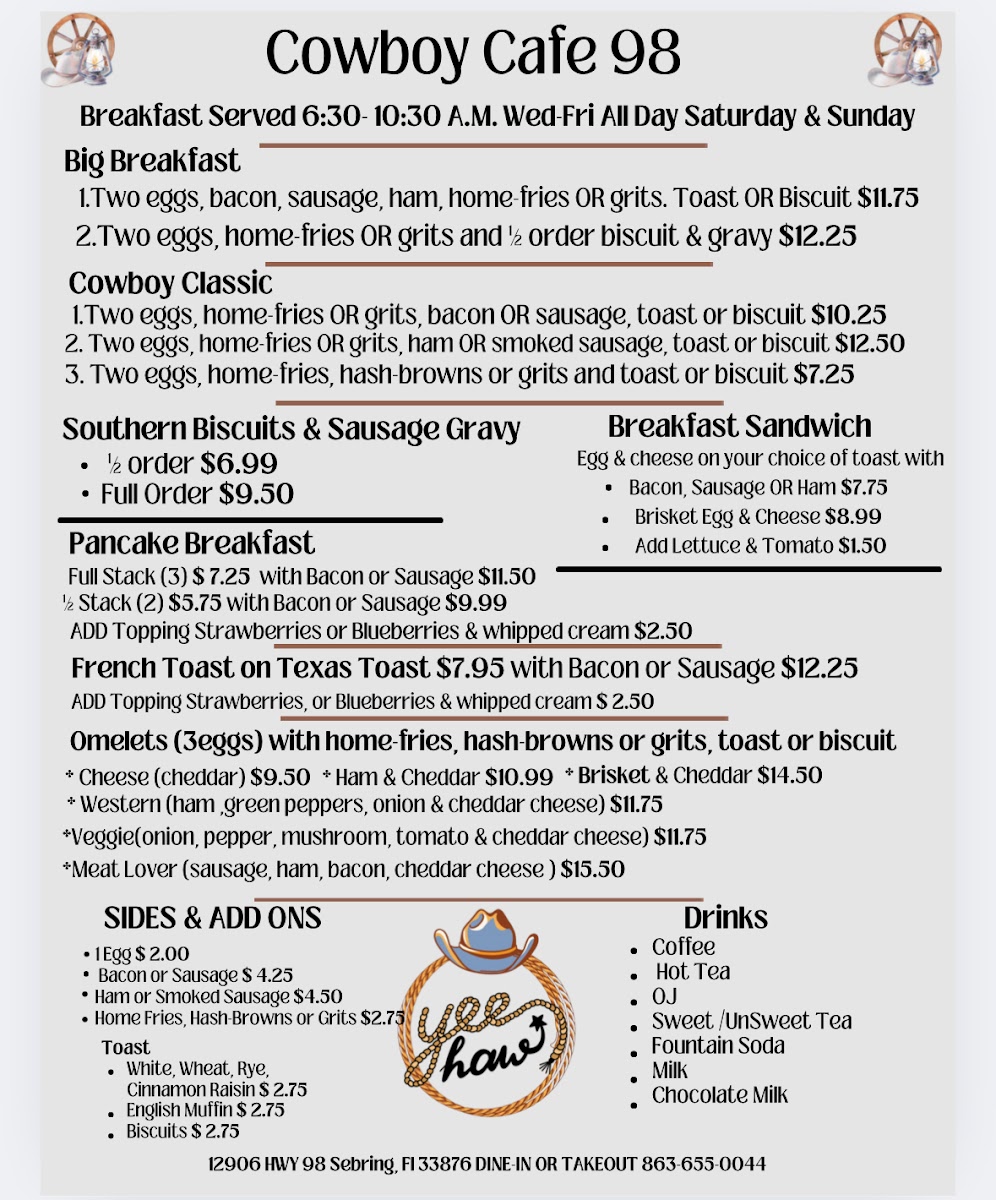 The menu at Cowboy Cafe 98 offers a wide variety of hearty breakfast, lunch, and dinner options that are perfect for any craving. For breakfast, the Big Breakfast includes two eggs, bacon, sausage, ham, and your choice of home-fries or grits, served with toast or a biscuit. If you’re looking for something with a southern twist, the Southern Biscuits & Sausage Gravy comes in both half and full orders. Pancake lovers can enjoy the Pancake Breakfast, with options like a Full Stack of three pancakes or a Half Stack with your choice of bacon or sausage. For a lighter breakfast, try the Breakfast Sandwich featuring egg and cheese on your choice of toast with bacon, sausage, or ham, or the savory Brisket Egg & Cheese. French Toast on Texas Toast is a standout for just $7.95, served with bacon or sausage. For those who enjoy omelets, Cowboy Cafe offers several varieties, including Cheese, Ham & Cheddar, Brisket & Cheddar, and a Western omelet with ham, green peppers, onions, and cheddar cheese. If you’re in the mood for lunch or dinner, the Steak-Burgers include options like a Cheeseburger, Bacon Cheeseburger, and Southern Fried Chicken Breast Sandwich. There are also Specialty Steak-Burgers such as the Jalapeno Cheeseburger and Cowboy Burger. For a smoky treat, try the Pulled Pork Sandwich or Brisket Sandwich from the Off The Smoker BBQ section. Cold sandwiches like the Turkey Club and Roast Beef are great for a lighter option. Appetizers like Fried Pickles, Onion Rings, and Fried Mushrooms pair perfectly with sides like Fries, Onion Rings, and Macaroni Salad. Whether you're looking for a filling breakfast, a delicious sandwich, or a savory BBQ dish, Cowboy Cafe 98 has something to satisfy every taste.